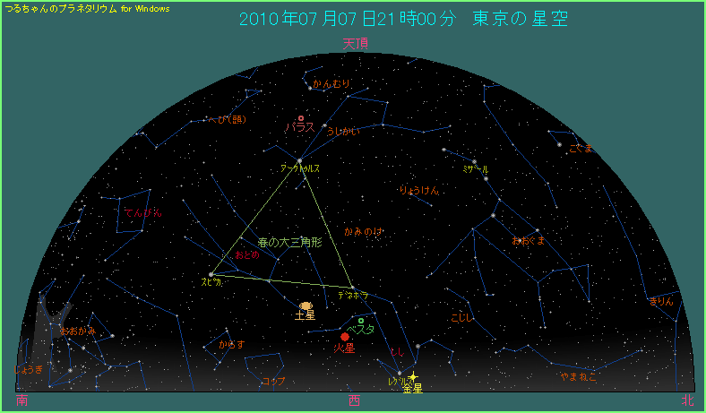 七夕の星たちに気をとられてしまうのはしかたありませんが、せっかく夜空を見上げるのですから、ついでに西の方向も見ておきましょう。2010年の場合は金星、火星、土星といった惑星が見えますので探してみましょう。いずれも低い位置に見えますから、時間がたつと西の空へ沈んでしまいます。ですから、少し早い目に見ておくのがポイントです。いずれも1等星以上の明るさがありますから、下の星図を参考に探してみてください。
