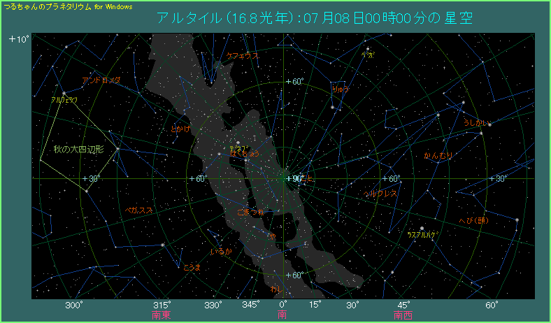 地球からアルタイルまでの距離は16.8光年。たったの(?)16.8光年移動しただけで、星座の形はずいぶんと崩れてしまっています。先に出てきた0時頃の星空の場合と見比べてみてください。