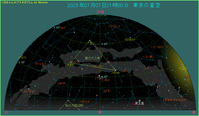 2025年の七夕の夜、東京で空が完全に暗くなるのは20時47分です。星図にある東京で21時頃ですと、月がほぼ南中しています。月齢12.1の大きな月明かりの影響をもろに受けますので、淡い天の川を見るのには適しません。