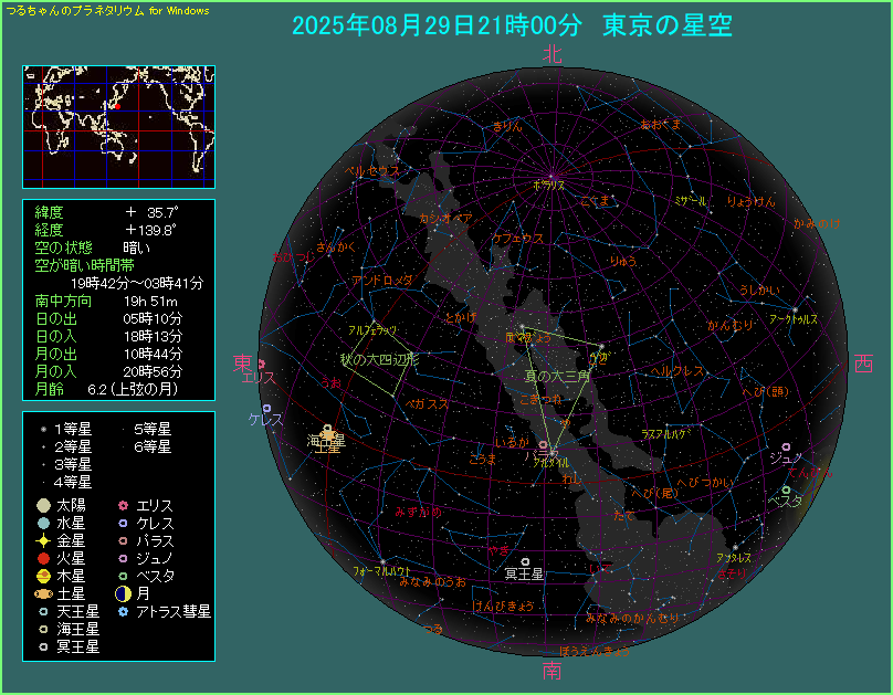 この日の月齢は6.2で、2日後が上弦です。星図のように東京で21時の場合は、月が沈んだ直後です。月明かりに邪魔されませんので、空が十分暗い場所から観察すると、天の川がはっきり見えるでしょう。しかし西の地域では、月の入りが遅れますので、もう少し時間がたたないと月が沈みません。例えば福岡の月の入りは21時39分です。