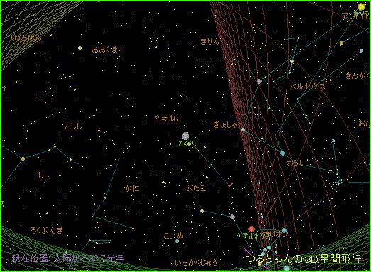 つるちゃんの3D星間飛行を使って、ポルックス(男役)からカストル(女役)へ接近してみましょう。
