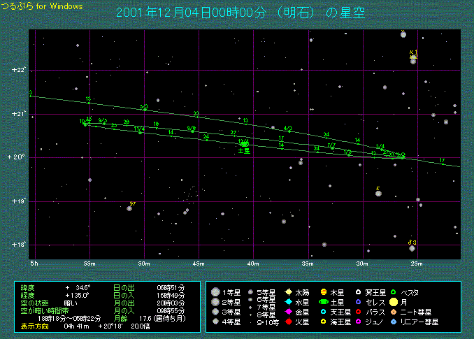 ・12月4日の衝の頃なら、21時なら東の空で高度50度、0時なら南の空で高度75度(ほとんど真上に近い感じでしょう)となります。同じ位置に見える時間は、半月経つごとに1時間ずつ早くなります。