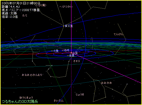 つるちゃんの3D太陽系シェア版を使って、2004年に地球へ近づくリニアー彗星(C/2002 T7)に乗って、火星大接近の様子を眺めてみましょう。