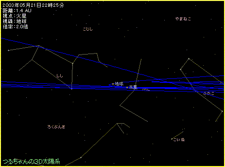 つるちゃんの3D太陽系シェア版を使って、火星大接近前後の火星から見た地球の動きを眺めてみましょう。 ※火星から見た地球が中央にくるように表示しています。 ※青い線は、各惑星の公転軌道です。 ※シミュレーションは7日間隔で表示しています。 ※何度も繰り返して表示しています。