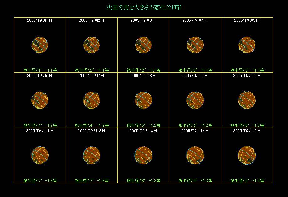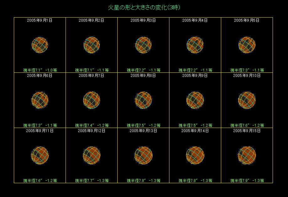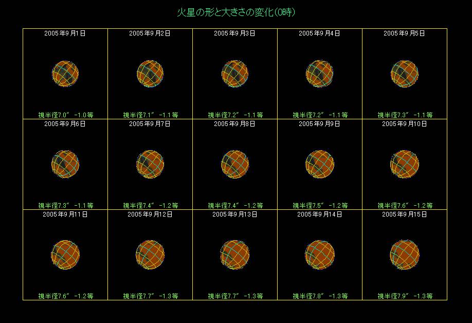 9月3日 9月10日 ・視直径(秒) 14.4 15.2 ・明るさ(等) −1.1 −1.2 ・距離(AU) 0.650 0.615 ・火星の出 札幌 20:49 20:28 東京 21:09 20:48 大阪 21:28 21:07 福岡 21:50 21:29