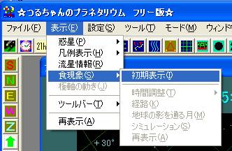 下の絵のように[表示]−[食現象]−[初期表示]を選択して、食現象の選択画面を表示します。