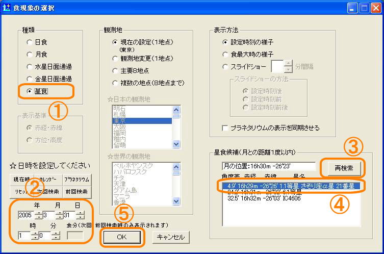 4)星食候補として[さそり座α星21番星]が表示されるのでこれを選択します
