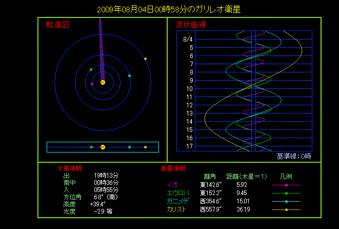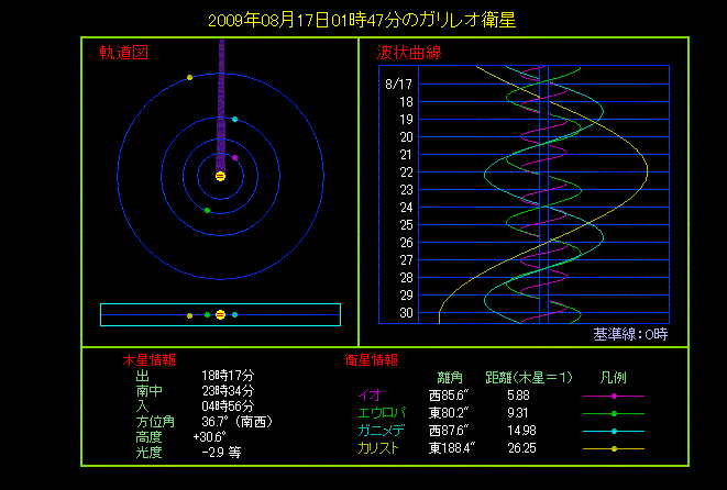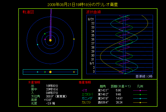 今月第一の見ものは8月26日のエウロパがガニメデの影に入る現象でしょう。減光幅は79%と大きいのでわかりやすいのではないかと思います。それから、8月21日に起こるイオがエウロパを隠す現象は、やや高度が低いのが難点ですが、掩蔽と食が連続して起こる上に、減光幅がいずれも40%以上あるのでこちらも面白いでしょう。