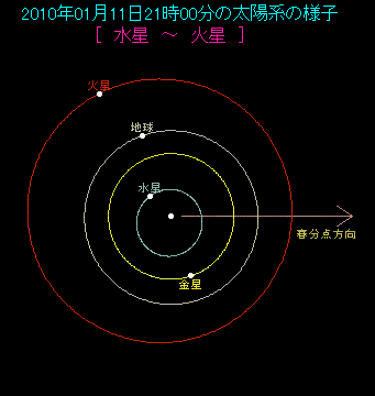 2009年後半に夜明け前の東天で明るく光り輝いて活躍していた金星ですが、1月11日に外合となって一時的に観測できなくなります。外合とは惑星が見かけ上太陽と同じ方向へやってくることで、惑星は太陽をはさんで反対側の一番遠い位置にいます。下の絵をご覧いただき、地球、金星、太陽の位置関係を見ると、おわかりいただけると思います。この日以降、金星は夜明け前の東天から日の入り後の西天へ移ります。5月16日の夕方に、月と0.5度まで大接近するなど、2010年もたくさんの見ものがありますから期待しまょう。