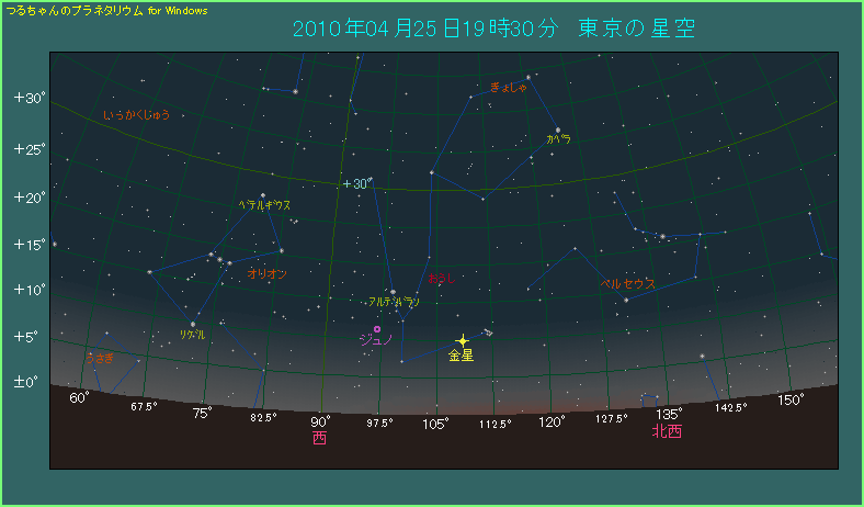 プレアデス星団(すばる)といえば4月17日に月が近づいて美しい眺めとなりますが、その8日後の4月25日には、今度は金星が近くを通り過ぎていきます。金星とプレアデス星団の距離は3.5度ありますから、接近というほどでもありませんが、それでも美しい眺めとなりそうです。