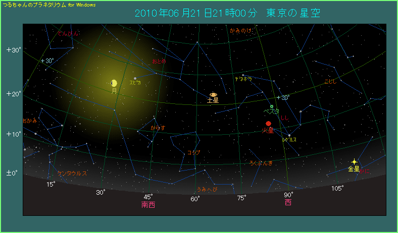 3月23日に衝となった土星は細い環を見せて活躍していましたが、そろそろ土星の天体観測も終盤となってきました。6月21日に東矩となって日没頃に南中するようになり、これ以降は夕方南西の空で、どんどんと高度が下がってきます。10月2日の合に向けて観測条件が悪化していきますから、条件の良いうちに土星を見たいという方は、早い目に観測しておきましょう。