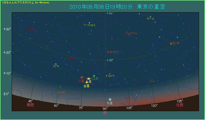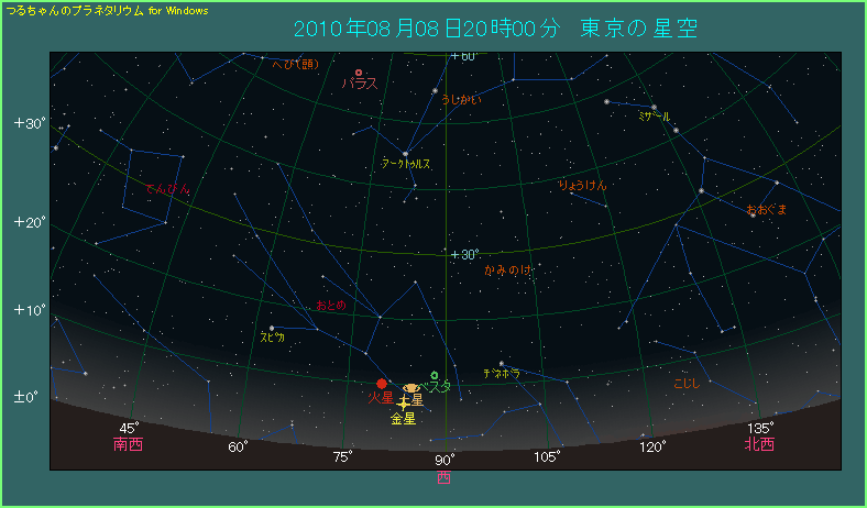 8月8日、東京 日の入りから40分後に見える3惑星と水星