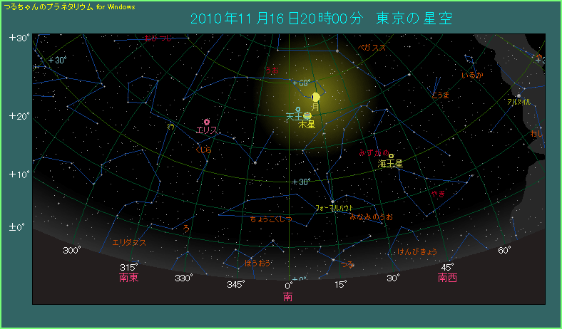 下の星図は東京20時の場合です。月と木星は南の方向に見えます。両者の間隔は東京20時の場合で6.1度とだいぶ開いています。木星は月から見て左下方向に見えます。