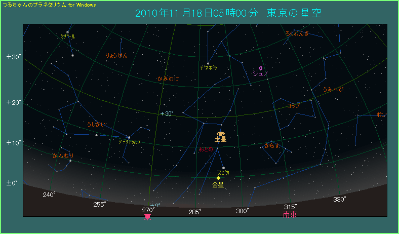 前後数日間は同じような位置関係が継続しますので、この日でなければ接近が見れないわけではありません。ただ、この日はしし座流星群の極大日ということもあり、流星観測した勢いでそのまま、ちょっとにぎやかな夜明け前の東天をのぞいてみられてはいかがでしょうか。