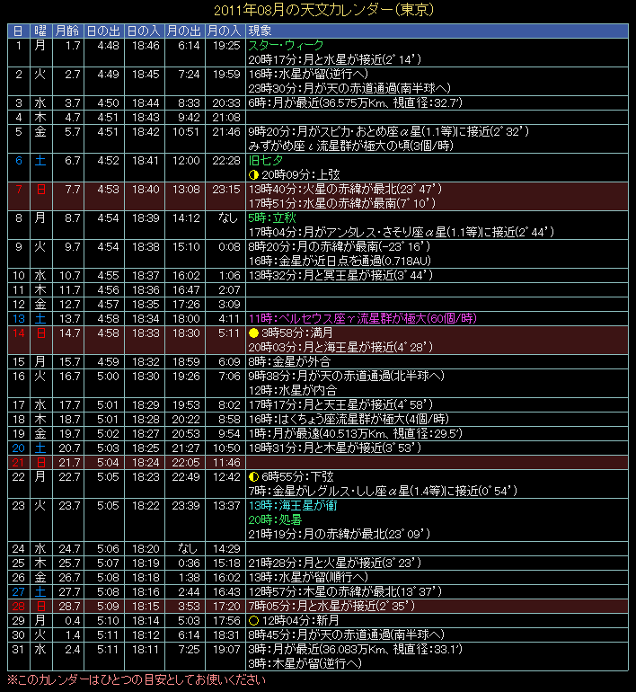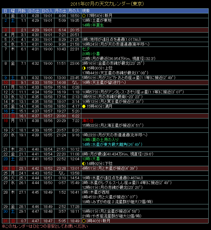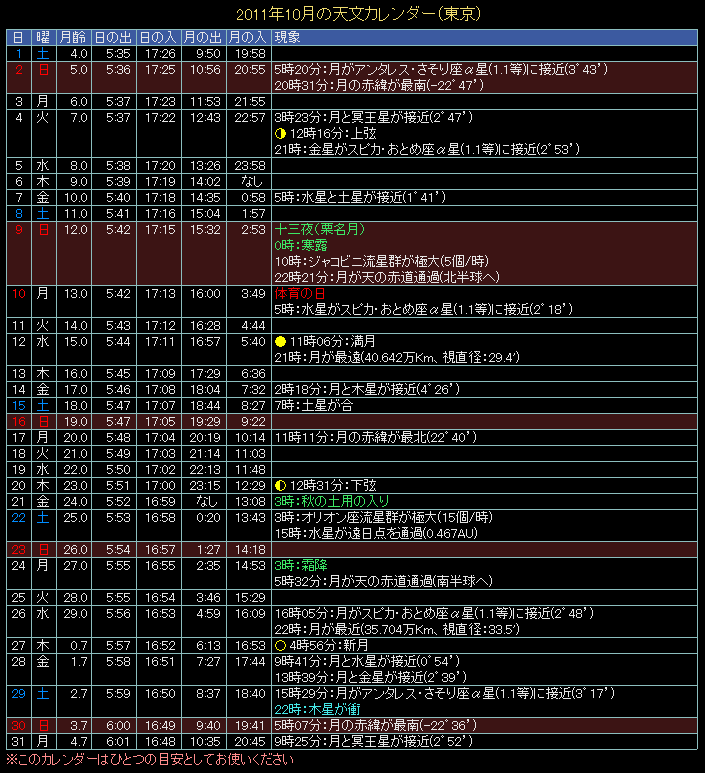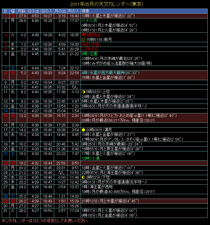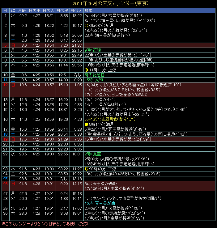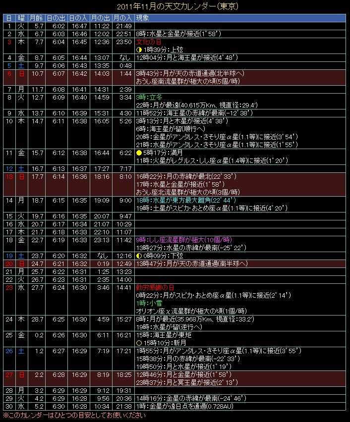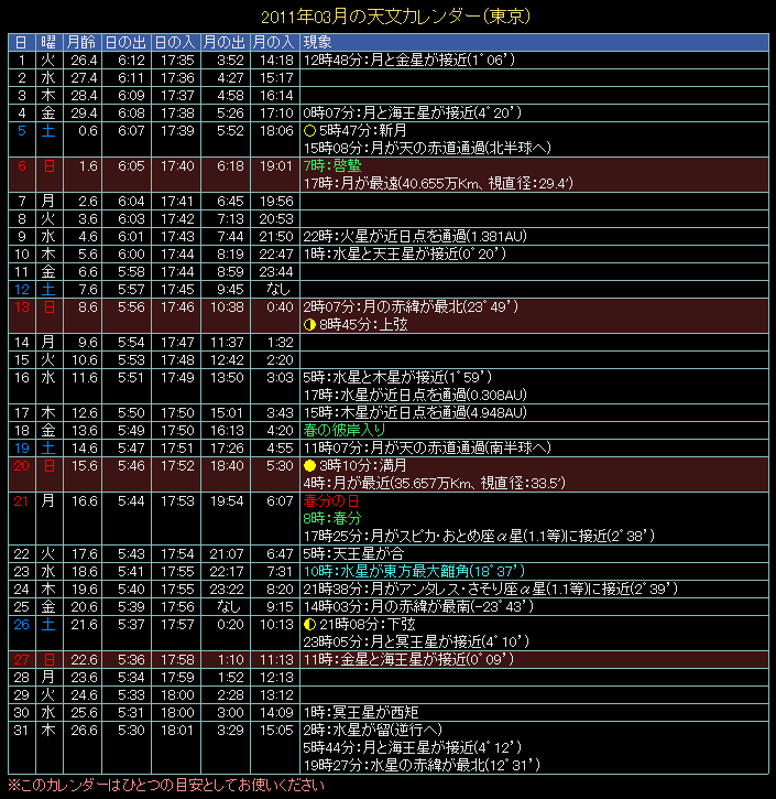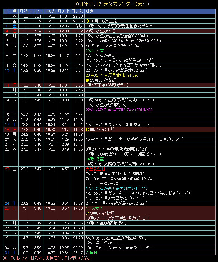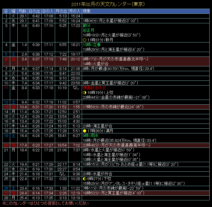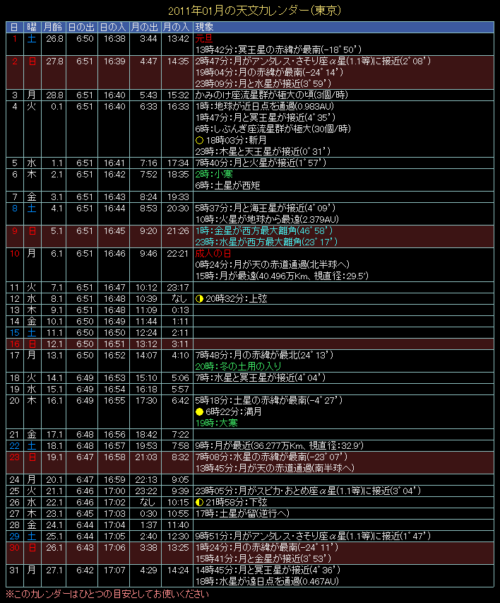 2011年の天文カレンダー
