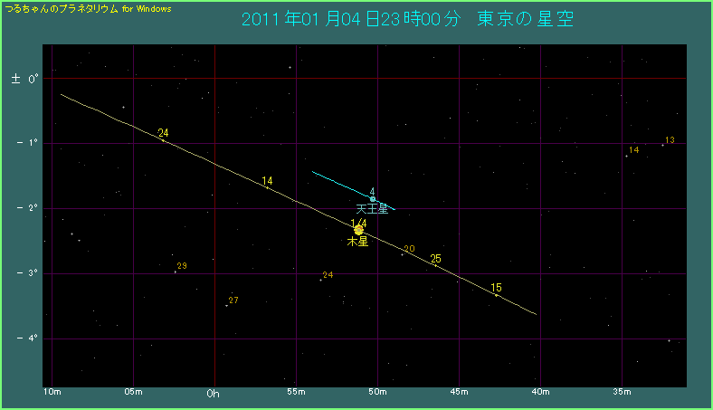 昨年6月8日と9月19日にそれぞれ0.4度強、0.8度まで近づいた木星と天王星ですが、年が変わった2011年1月4日にも3度目の接近が起こります。今回も大接近といえる0.5度の距離まで近づきます。
