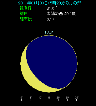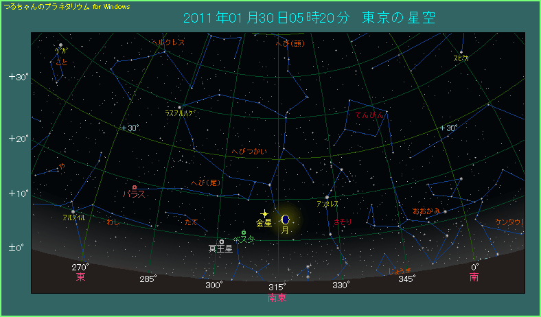2011年は元旦に月と金星が接近して幕を開けましたが、同じ月の1月30日に再び月と金星が近づきます。下の星図のように、空が白み始める頃には月から見て金星は左側からやや上方向に並んで見えます。といっても今回もそれほど接近するわけではなく、両者の間隔は5.3度と広い目です。とはいえ元旦の8.3度と比べるとだいぶ間隔が狭まっていますから、もう一度見ておかれて損はないでしょう。なお、次回の接近は3月1日となります。