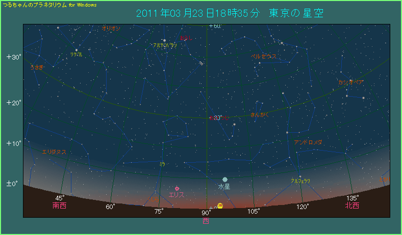 下の星図をご覧ください。3月23日に東京で日の入り時刻から40分後、水星が見える位置です。日の入り40分後ということもあって、空はまだ明るい状態です。水星は0等級の明るさがありますが、空の明るさに負けてしまってかなり見づらいでしょう。時間がたてば空が暗くなって見やすくなるはずですが、水星の高度が下がって大気の影響を受けやすくなって逆に見づらくなります。ほどよい頃をねらって水星を見つけてください。双眼鏡をお持ちの方は用意しておかれると助けになります。