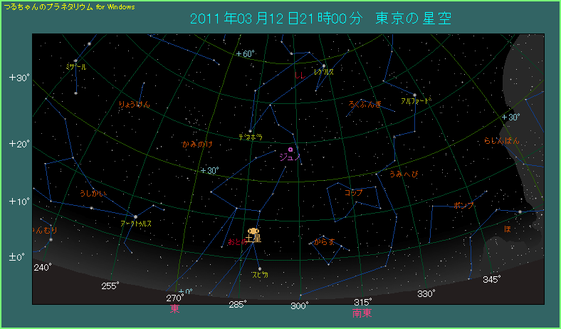 ジュノといえば4大小惑星の一つで、1804年にドイツの天文学者ハーディングによって発見されました。直径が240Kmと小さいのであまり明るくありませんが、条件が整うと7等台まで明るくなります。今年は3月12日にしし座の足元付近で衝となり、8.8等まで明るくなります。この明るさは口径50mm程度の双眼鏡でも空が暗い場所からなら見える明るさですが、街中からでは苦しいでしょう。3日ほど間隔を開けて観測し、天体が移動していることが確認できればジュノであることに間違いありません。近くには20番小惑星マッサリアも同じくらいの明るさで見えますから、いっしょに見ておいてください。ジュノは3月23日頃にしし座σ星、マッサリアは3月23日にτ星に近づきますので目印にするとよいでしょう。