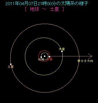 最近の木星は次第に太陽へ近づいていましたが、とうとう4月7日に太陽と同じ方向へやってくる合(ごう)となります。下の図を見ると、地球と木星は太陽をはさんで反対側に位置しています。こうなるとまぶしい太陽にじゃまをされて、木星を観測することができなくなってしまいます。その後しばらくすると、夜明け前の東天に姿を見せるようになります。