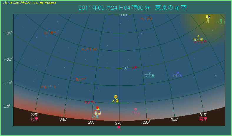 5月初旬から起こってきた惑星同士の接近ですが、そろそろ終盤が近づいてきました。4月下旬頃には最も離れた位置関係にあった金星と火星ですが、5月24日に1度まで接近します。金星は十分に明るくて肉眼でも見つけられますが、火星は双眼鏡の助けがないと難しいでしょう。双眼鏡を金星に向けてから、そのすぐ左上を探しましょう。ポチッと光る星が見つかれば、それが火星です。金星の下からやや左側には水星が見えるかもしれませんので、こちらも双眼鏡を使って探してみましょう。