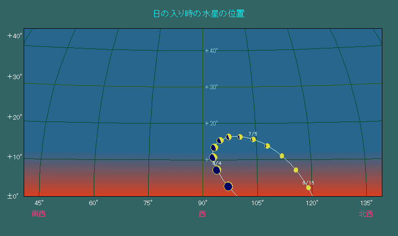 水星は年に6回太陽から最も離れる最大離角となります。しかし、最大離角の頃がいつも見つけやすい好条件というわけではありません。それは、太陽からの離角が大きいからといって、日の入り時刻や日の出時刻における水星高度が高いわけではないからです。