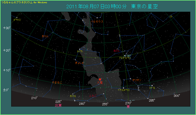 夜明け前に見える火星とふたご座