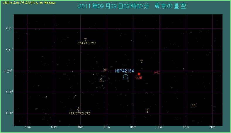 2011年の火星は2月6日に合となった関係で、今年は衝はありません。来年3月5日に起こる衝に向けてほんのわずかずつ、地球との距離を詰め始めているところです。そんな火星の近況ですが、ここで一つ話題があります。それは、火星がかに座の恒星の上を通過する現象が見られるからです。恒星はHIP42164という7.5等星で、プレセペ星団のはずれにあります。