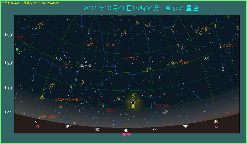 星食は月が恒星を隠す天文現象です。暗い恒星なら頻繁に起こっていますが、明るい恒星となるとそれほど多くは起こりません。10月1日の夕方には、さそり座のδ星(デルタ星)が月に隠される星食が起こります。さそり座δ星はジュバと呼ばれる2.3等星です。さそり座の1等星アンタレスの西側(右側)には青白い星が3つ縦に並んでおり、δ星はその真ん中の星です。
