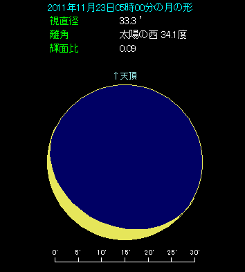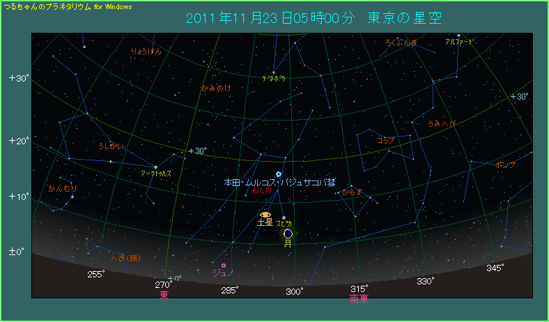 当サイトでは紹介していませんが、土星は先月10月15日に合となって太陽と同じ方向にやってきました。その後土星は夜明け前の東天にまわっています。合から日がたっていませんので、まだまだ高度が低くて観測しづらいですが、11月23日に月が近づいて、夜明け前の低空で美しい眺めになりそうです。おとめ座の1等星スピカも近くに見えますので、きっとにぎやかなことでしょう。実は今年2011年の4月17日にも3者がゆるやかに集まりましたが、その時と比べて今回の方が密度が高くなっています。この点にも注目しましょう。