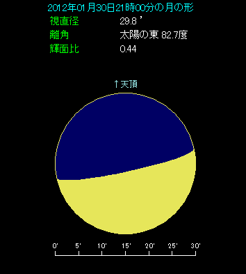 月と木星は年初の1月3日に近づきましたが、1月30日にも再び近づきます。下の星図は21時頃、東京から見た西天のようすです。下側が光る半月の左隣に−2.4等の木星が見えます。間隔は4度強で、1月3日の時よりも近づいています。最近にしては接近している方ですので、ご覧になっていただければと思います。なお、今年は7月15日の日中に、南西諸島を除く地域で木星食が見られますから、こちらにも期待しましょう。