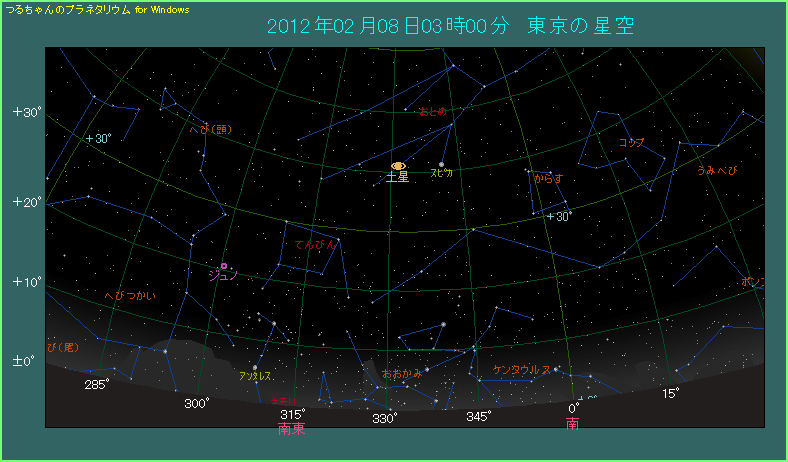 土星は遠い天体ですからあまり大きく動きませんが、おとめ座の中で少しずつ移動しています。土星は2012年1月17日に西矩となって観望期が近づいていたところですが、2月8日には留となります。以降は恒星に対して西から東へ移動する順行から、東から西(星図では左から右)へ移動する逆行へ移行します。そして4月17日に起こる衝に向けて観測条件が良くなっていきます。いよいよ土星も観望期入りですね。