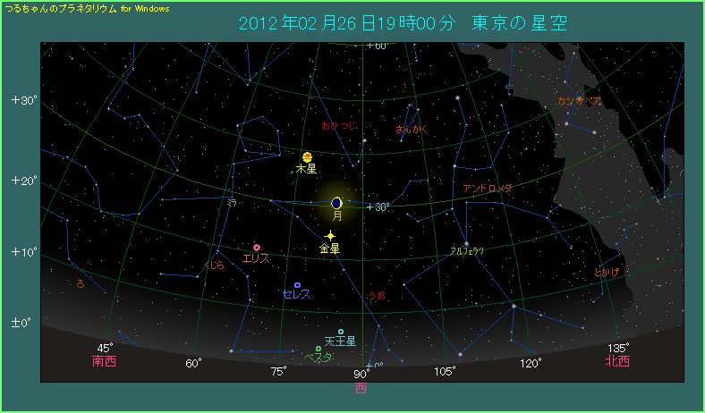 宵の明星として輝く金星が高度を上げてきています。2012年2月後半には、日の入り時刻における金星の高度が40度を超えてきます。とても明るく光る金星だけに、いやでも人目につきますが、25日から26日にかけて月が近づいて、さらに人目を引きそうです。