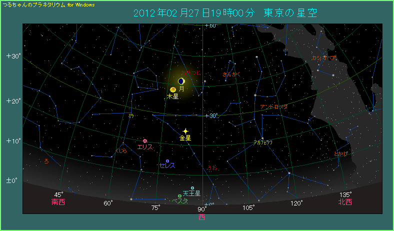 2月25日から26日にかけて、月は金星に近づきましたが、今度は2月27日に木星へ近づきます。金星の場合よりもちょっぴり近づいて、最接近する11時頃だと3.2度まで近づくのですが、日没後に空が暗くなる頃にはもう少し間隔が開いています。下の星図は19時頃、東京から見た西空のようすです。月は木星の右上に見えます。大きく下方向には金星も見えますが、こちらはもっと間隔が開いています。連日明るい惑星と月の接近が起こり、楽しみですね。