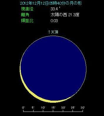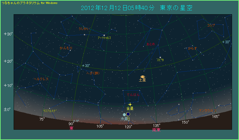 前日の12月11日は月が金星と土星の間に割って入りました。その翌日の12月12日は、月が水星の右横にやってきて接近します。最も近づくのは東京の場合で8時15分。その間隔は1.9度となっています。