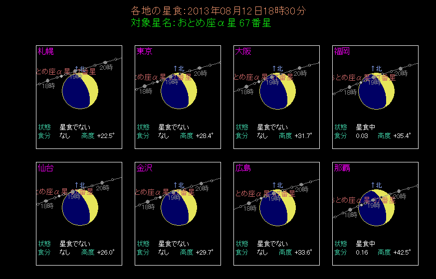少しわかりづらいですが、18時30分にスピカが見える位置を、小さな白い丸印で示しています。南に位置する那覇では星食中ですが、他の地点ではまだ食が始まっていません。北に位置する札幌では食とならず、月の縁に大接近するにとどまります。