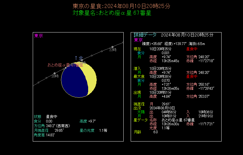 次回に東京で同現象が見られるのは2024年8月10日で、11年後のことになります。この時も今回と同じような経過をたどりますが、食の開始時間が遅いため、暗夜でスピカ食を楽しむことができそうです。