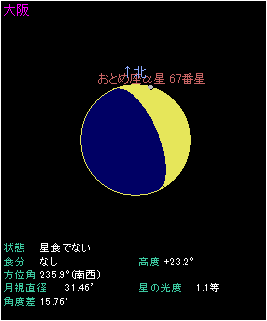 大阪は日本での標準的な見え方をします。スピカの潜入は日の入りの10分前に起こるため、空が明るい状態です。肉眼で観測することはできませんし、双眼鏡でも厳しいことが予想されます。出現は日の入りから34分が経過していますが、まだまだ見えにくいでしょう。しかも月の明部からの出現となります。月縁とスピカとの明度差が大きく識別しづらいことから、できれば天体望遠鏡で観測したいところです。