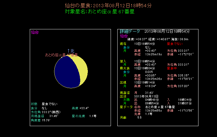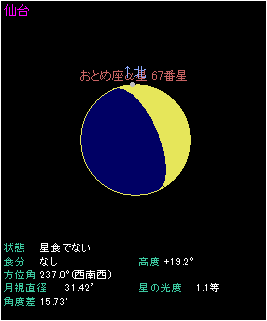 仙台は国内では北に位置しており、北限線に近い位置です。このため、他の観測地点よりも月の北端に近いところをスピカが通過します。その分だけ月に隠れる時間も短くなります。スピカは18時54分に月の暗部へ潜入し、20分後に月の明部から現れます。出現の頃でも日没から40分しか経過しておらず、空はまだまだ明るいでしょう。肉眼での観測は難しいので、双眼鏡か天体望遠鏡を使って観測されることをおすすめします。