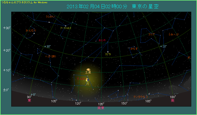 下の星図は間隔が狭い方の2月4日2時頃を表示しています。月と土星が縦に並んでいることがわかります。月齢は22.9、輝面比は0.49ということで、月はちょうど半月形をしています。月のクレーターを見るのに適した月齢ですから、天体望遠鏡をお持ちの方は、土星と月と両方をご覧になると、楽しさ倍増でしょう。