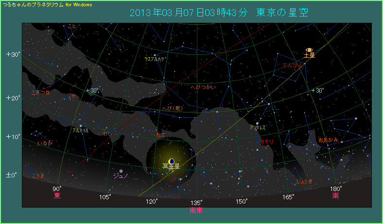 そんな折、2013年3月7日、ついに冥王星食が起こります。東京では1934年7月12日以来79年ぶりとなりますが、この時は昼間に起こりました。また夜間に起こるのは、1926年1月27日以来、87年ぶりの出来事です。といっても冥王星は小型なうえに遠いところにある天体です。明るさは14等級ですから、存在を確認するためには、アマチュアが使う天体望遠鏡くらいでは歯が立ちません。
