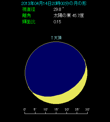 先月の18日は月と木星とアルデバランが正三角形に並びましたが、4月14日には同じ3天体が再び集まります。下の星図は20時に東京から見た西天のようすです。月とアルデバランの間隔は3.1度と接近状態ですが、月と木星の間隔は5.1度ほど開いています。また、木星とアルデバランにいたっては6.6度もあり、だいぶ間隔が開いています。月は月齢4.1で三日月形をしており、右下側が光っています。
