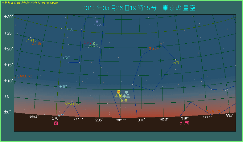 惑星同士の接近は毎年何度か起こっています。しかし、3つの惑星が近づくとなると、そんなに多く起こるものではありません。下の星図は2013年5月26日と27日、東京から見た西北西の空を少し拡大したもので、金星と木星と水星の三惑星が集まっています。時刻は日の入りから30分弱が経過しています。