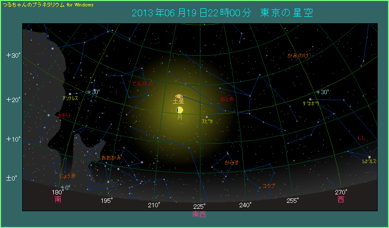 毎月のように月は様々な天体と接近を繰り返していますが、6月19日から20日にかけての深夜には、月と土星が近づきます。といっても、最も近づく20日2時39分頃(東京)でも間隔は4.3度ほどですから、それほど近づくわけではありません。また、最接近の頃には月と土星は沈んでしまっていますから、実際に観測できるわけではありません。下の星図は6月19日22時頃のようすです。南西の空で、月の上側に土星が見えることがわかります。
