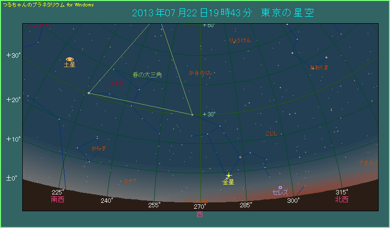 下の星図は日の入りから50分が経過した西空のようすです。-3.9等で光り輝く金星の左下にレグルスがあります。レグルスは1等星の明るい恒星とはいえ、薄明中の低空で肉眼で見つけるのは骨が折れそうです。できるだけ双眼鏡を使われた方が良いでしょう。