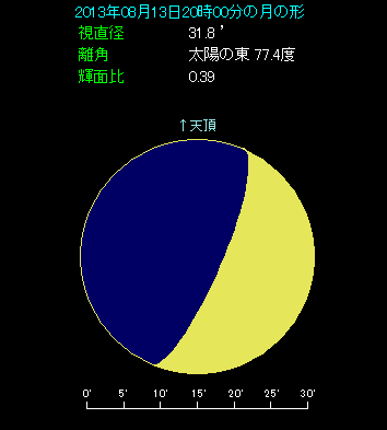 毎月のように月と土星が近づいていますが、今月も8月13日に近づきます。東京から見た場合、最も近づくのは14時過ぎ頃で、このときの間隔は3.6度です。下の星図のように、空が暗くなって実際に観測することのできる20時頃だと、両天体の間隔はもう少し開いて3.9度となっています。