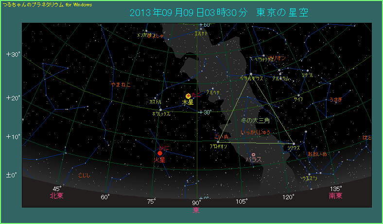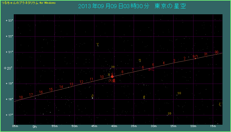 星団の中心部に最も近づくのは9月9日の2時頃で、かに座が昇ってくるのもその頃ですから、時間的にはちょうどいいタイミングです。双眼鏡で火星を視野に入れると、小さなプレセペ星団の星たちが火星を取り巻いて光り、美しい眺めとなるでしょう。