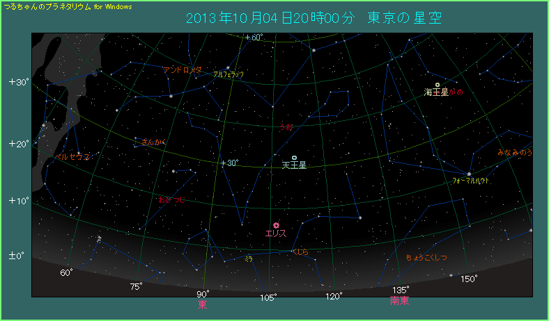 下の星図は10月4日20時頃、東南東の空のようすです。天王星はうお座とくじら座の境界付近にあります。明るさは5.7等ですから肉眼では難しく、双眼鏡の助けを借りなければなりません。幸か不幸か天王星の近くには、6等級よりも明るい星が少ないですから、比較的確認しやすい位置にあるといえます。また、視直径は3.8秒しかありません。天体望遠鏡を使って倍率を上げても、ごく小さな円盤像に見えるのがやっとで、表面模様を確認するのはとても無理な話です。しかしそれでも、独特の青緑色をしているのがわかるでしょう。