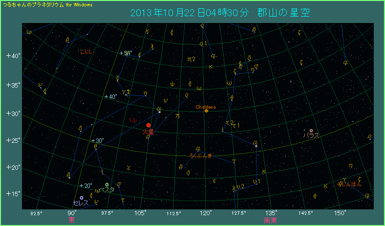 下の星図は福島県郡山市から見た場合に、小惑星カルダエアが見える位置を示したものです。南東から東南東にかけて、高度が40度くらいの場所になります。しし座の1等星レグルスから右方向へ10度ほど離れた位置ですから、比較的探しやすいでしょう。星図を頼りに探してみてください。