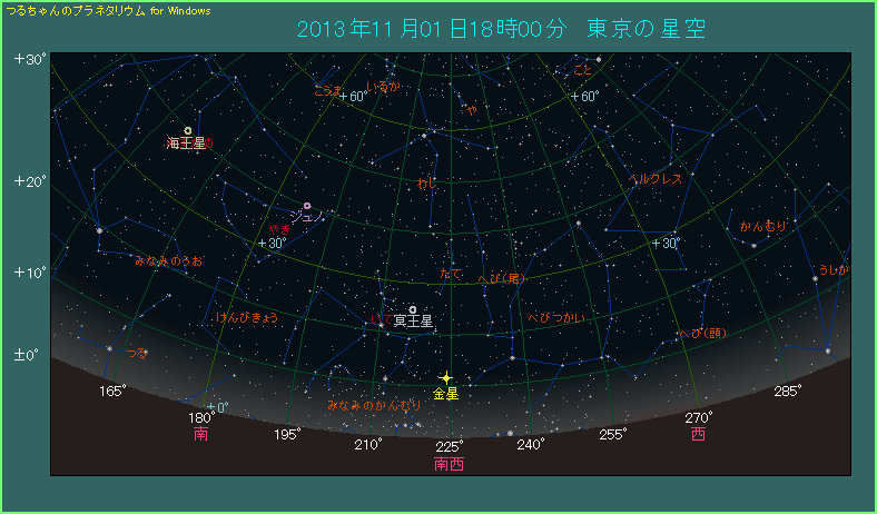そんな金星ですが、11月1日に東方最大離角を迎えます。最大離角の頃には太陽から最も離れることから、通常では高度が40度くらいに達し、強烈な輝きに目を奪われるのですが、今年はそうもいきません。日没後に低い位置で、なんとなく申し訳なさそうに控えめに光っている感じがします。しかも西の空ではなく、南西の方角に見えますから、この点でも今年の場合は、少し例年とは違っています。
